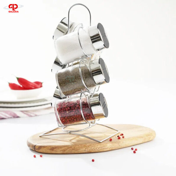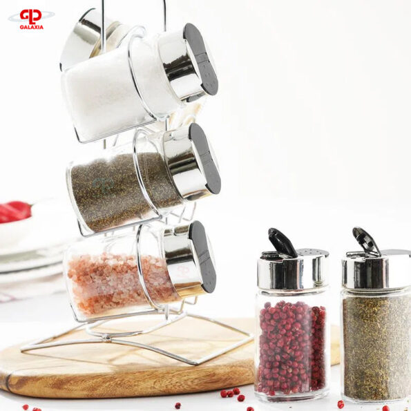 Este especiero está diseñado para contener seis frascos de especias, que se colocan en una base de acero cromado. Cada frasco está hecho de vidrio resistente y tiene una tapa de rosca doble función para mantener las especias frescas y secas.