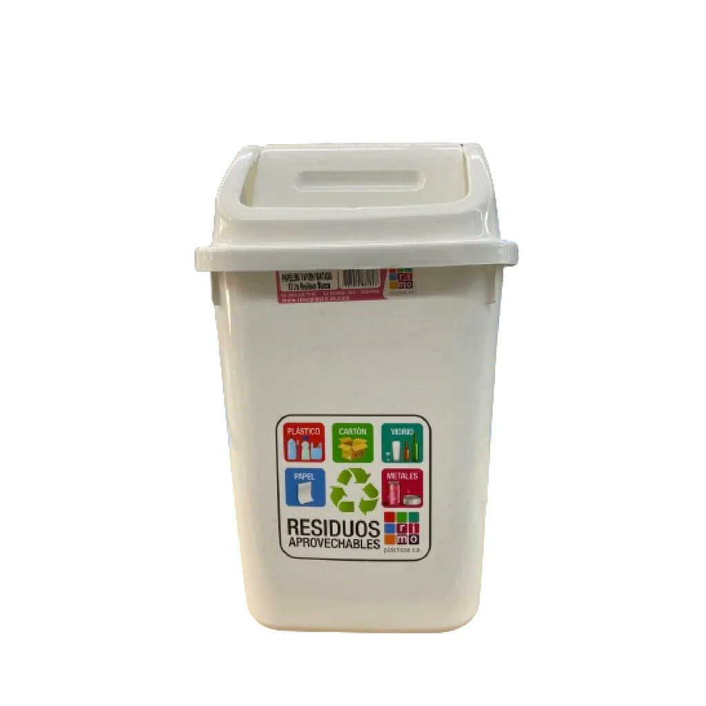 Papelera Vaivén Fantasía de 12 litros en color blanco de la marca Rimo. Fabricada en plástico resistente, con tapa oscilante para fácil acceso y control de olores.